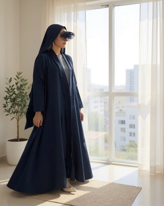 Italian Linen Frayed Abaya Set in Cloche Cut (Navy)