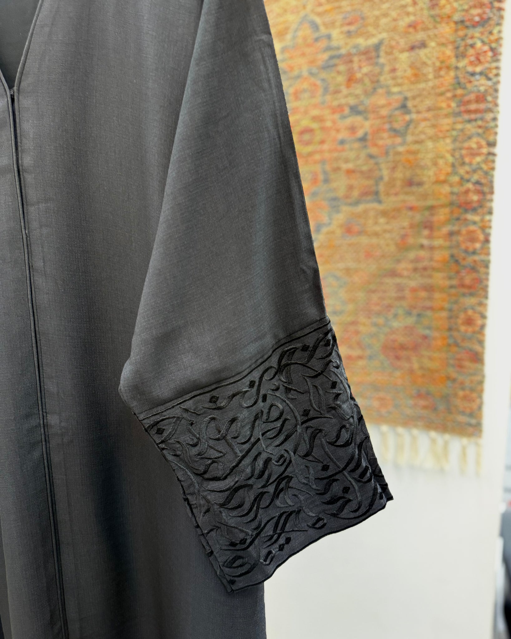 This Black Abaya, crafted from luxurious Italian Linen, embodies effortless grace with a modern cultural touch. Its defining feature is the intricate Arabic calligraphy embroidery delicately woven onto the wide sleeves, blending tradition with refined artistry.