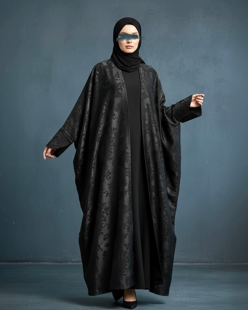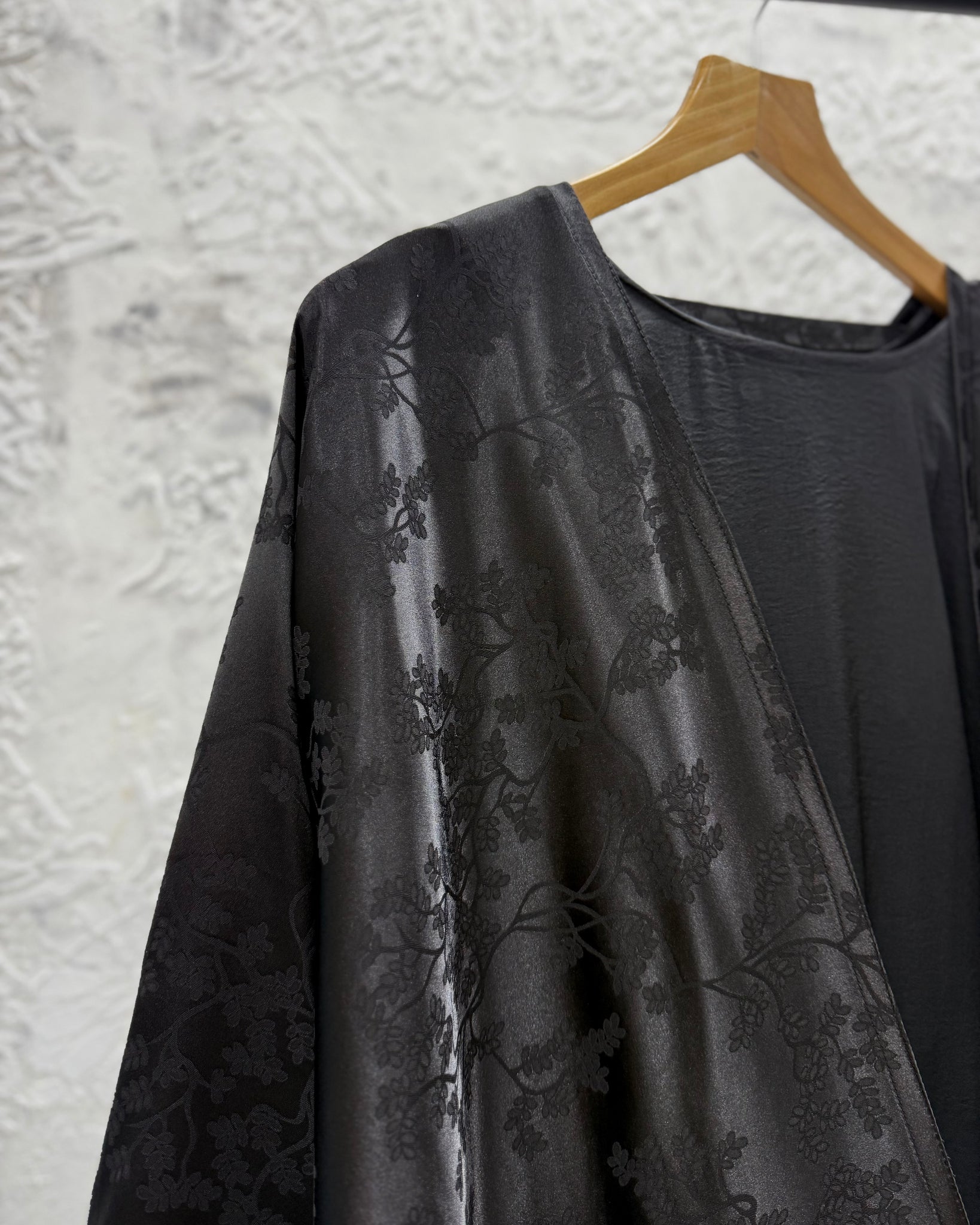 Our cherry blossom silk jacquard abaya is a refined statement piece designed for elegant occasions and Eid wear. Crafted from premium silk-feel jacquard, the fabric features a subtle woven cherry tree motif, creating depth, texture, and a soft, luminous finish.