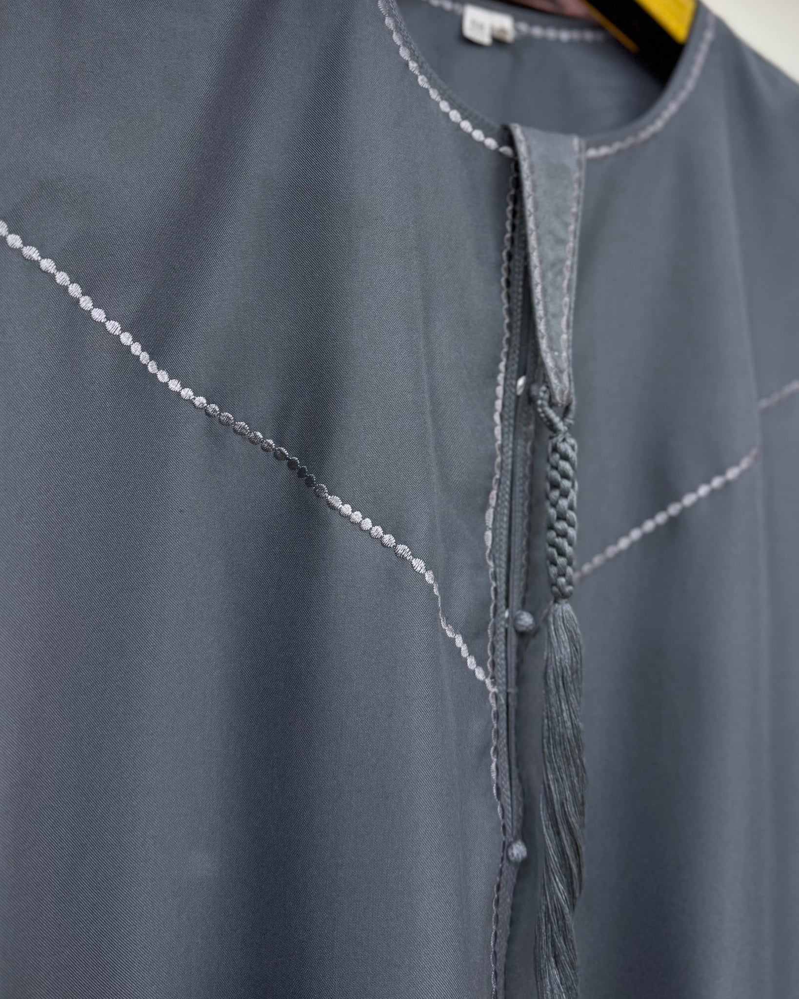 The thobe features a classic straight cut, allowing ease of movement while maintaining a clean silhouette. Subtle chest seam detailing reflects traditional Emirati tailoring, while the hand-finished braided tassel neckline adds an authentic finishing touch.