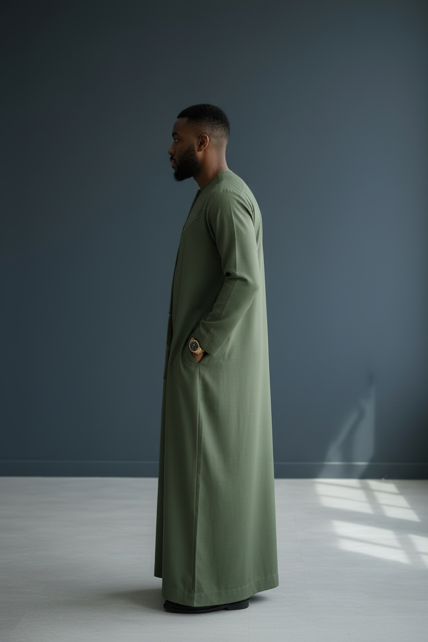 This Emirati-style thobe is crafted from high-quality cotton fabric, offering a breathable, lightweight feel with a smooth, structured drape. Designed in a refined olive green tone, it delivers a timeless look suitable for both daily wear and special occasions.
