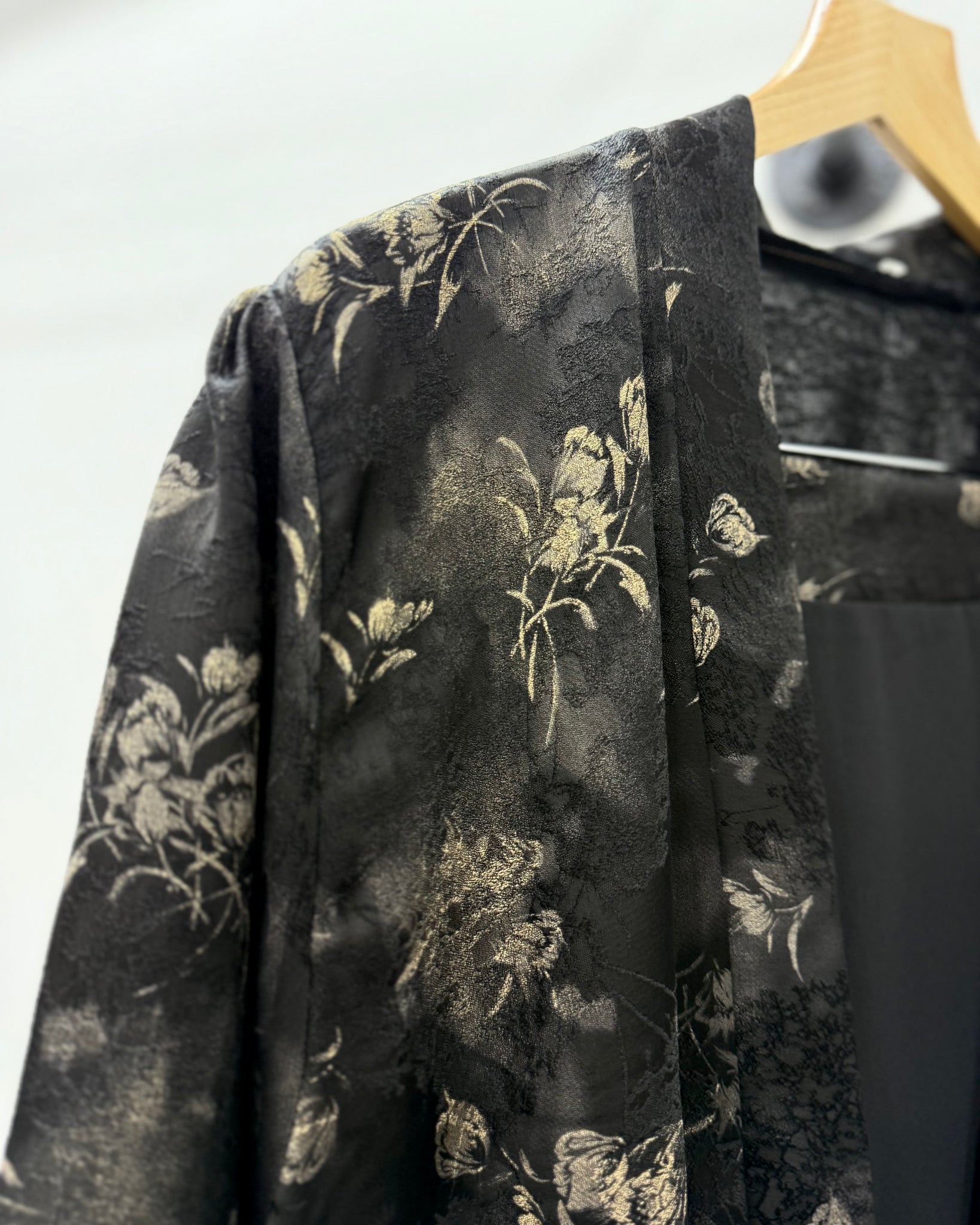 Crafted from premium Turkish Jacquard, this abaya beautifully combines timeless sophistication with subtle artistic texture. The fabric features an intricate woven floral pattern in muted gold tones over a deep black base, giving it an elegant, slightly lustrous finish that catches the light gracefully.