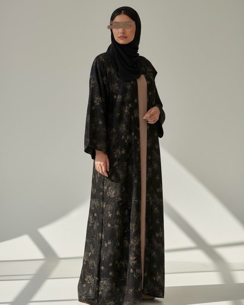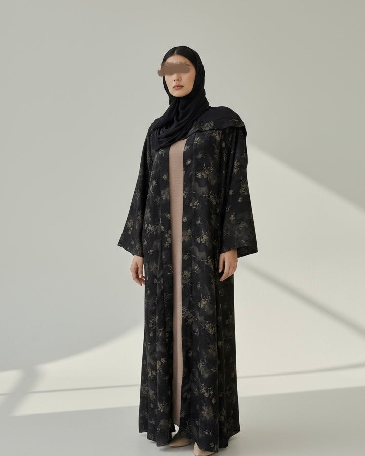 The abaya’s flowing silhouette and soft structure create a flattering drape, making it perfect for both everyday refinement and special occasions. The luxurious jacquard weave adds depth and dimension to the look while remaining modest and comfortable.