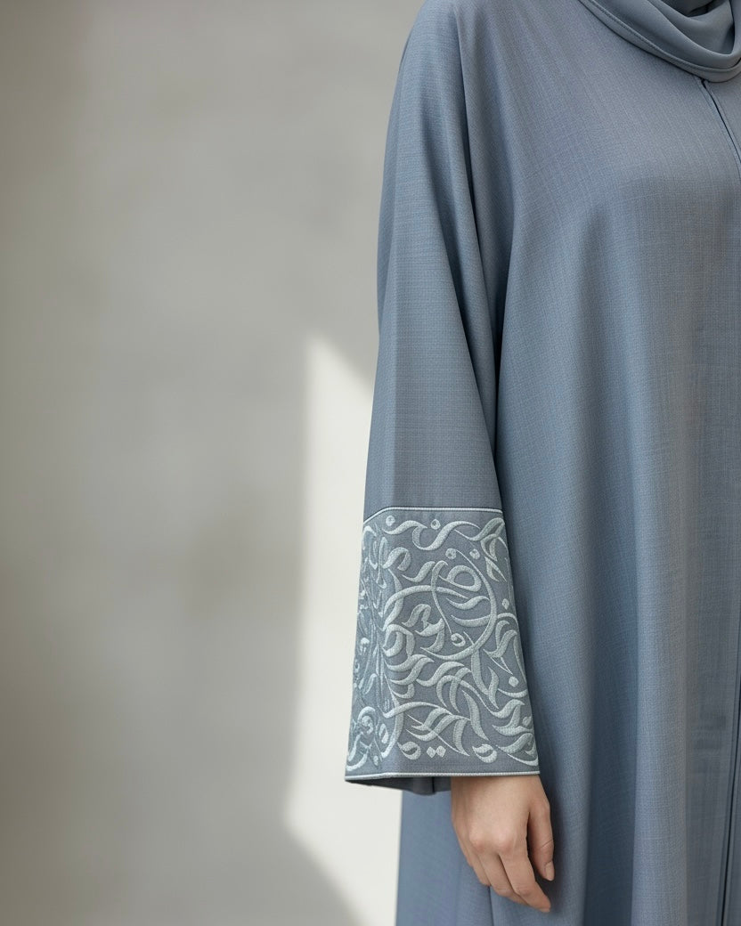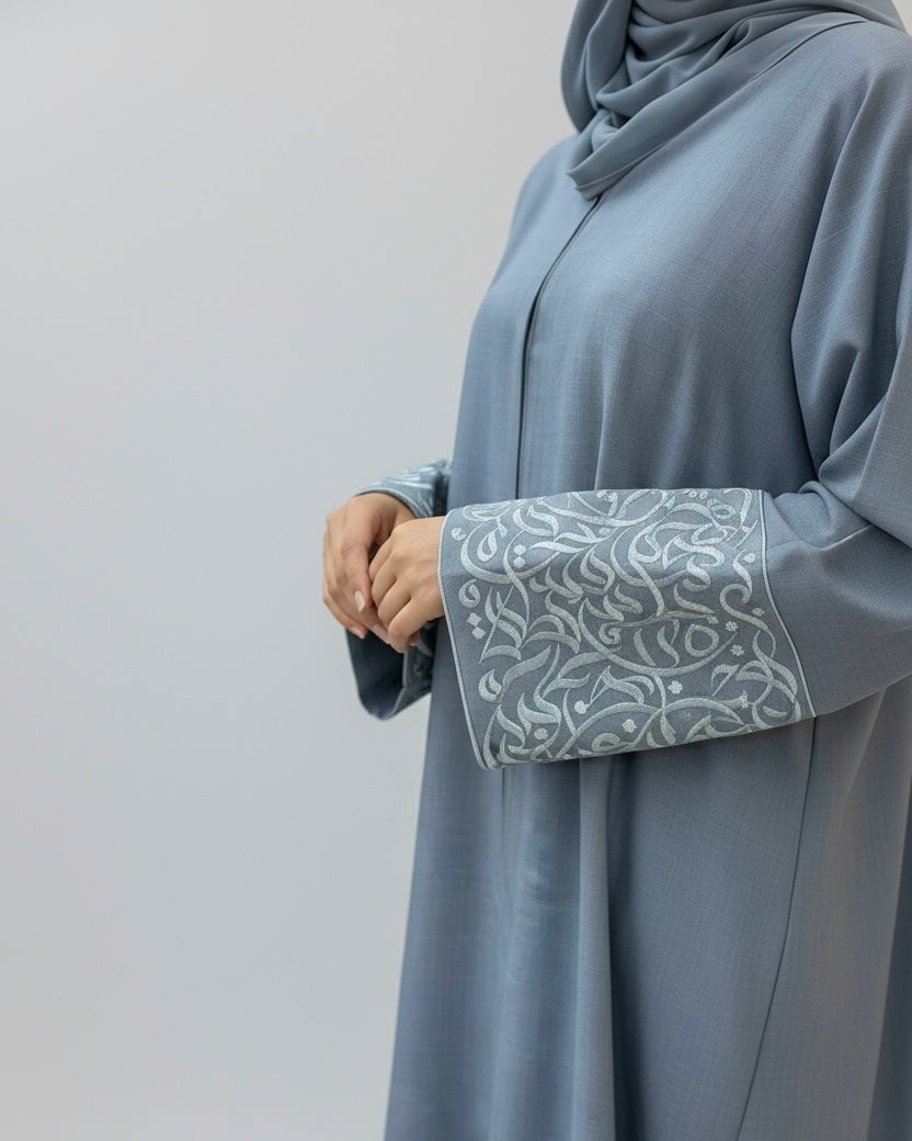 This cool blue tone Abaya, crafted from luxurious Italian Linen, embodies effortless grace with a modern cultural touch. Its defining feature is the intricate Arabic calligraphy embroidery delicately woven onto the wide sleeves, blending tradition with refined artistry.