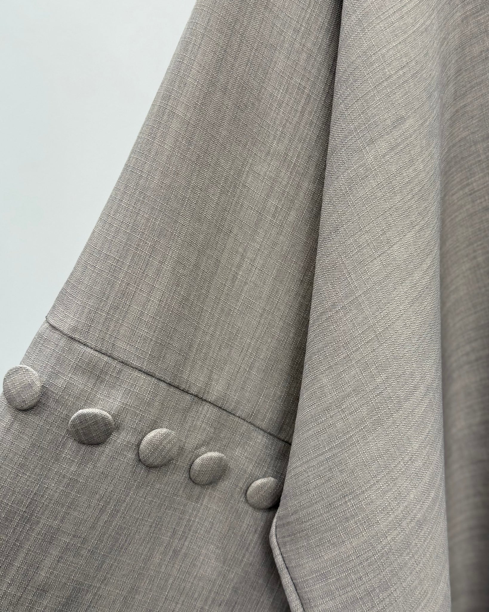 The abaya features wide sleeves with a row of fabric-covered buttons, adding a contemporary touch while keeping the overall look understated and chic. Lightweight and breathable, it’s an ideal choice for year-round wear, offering both comfort and sophistication.