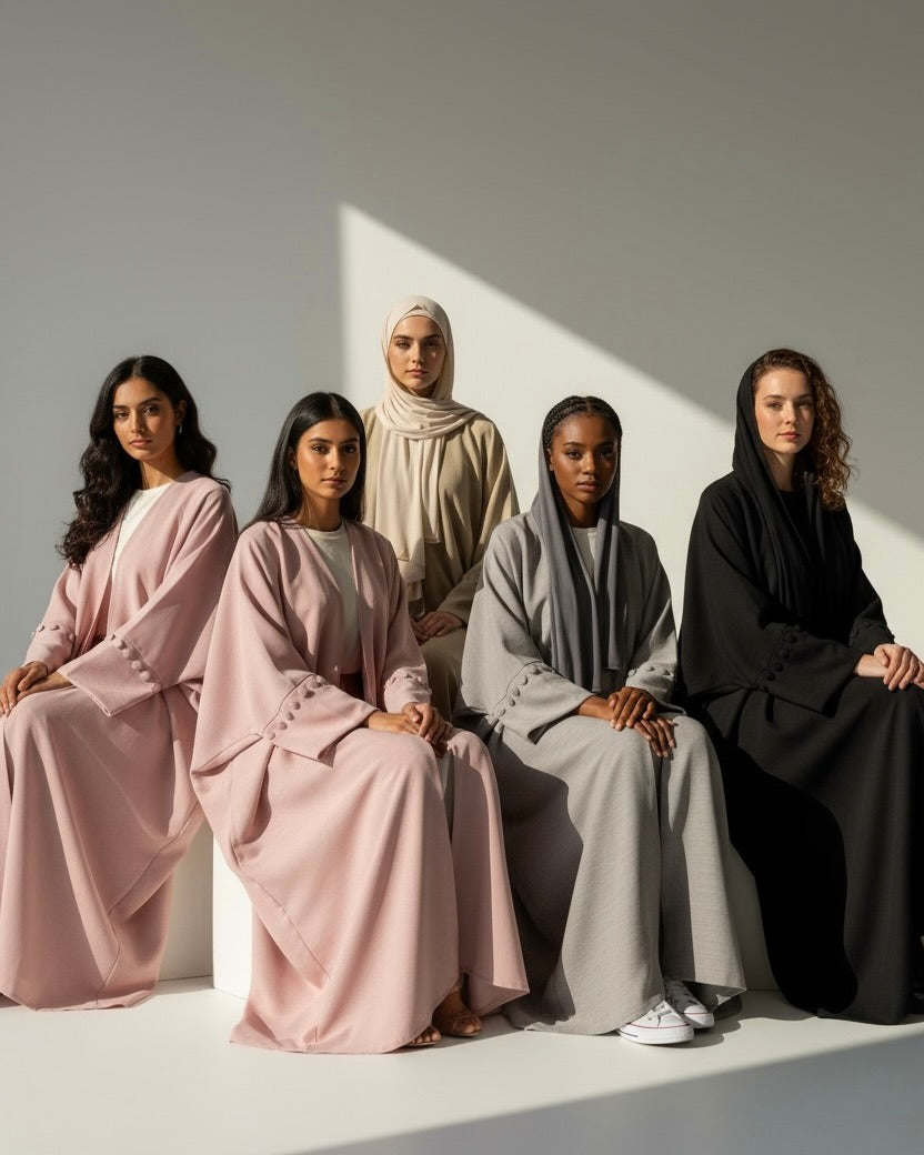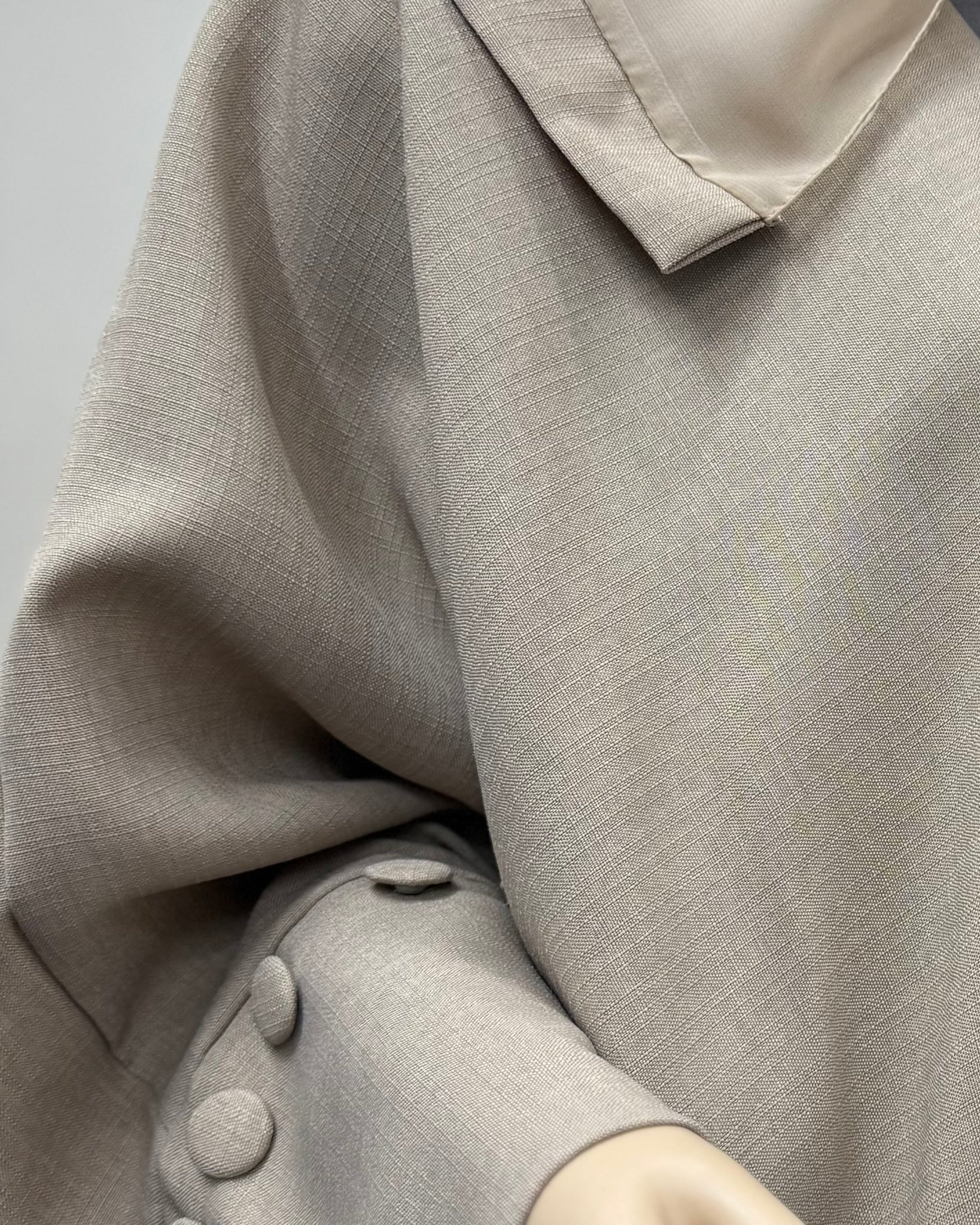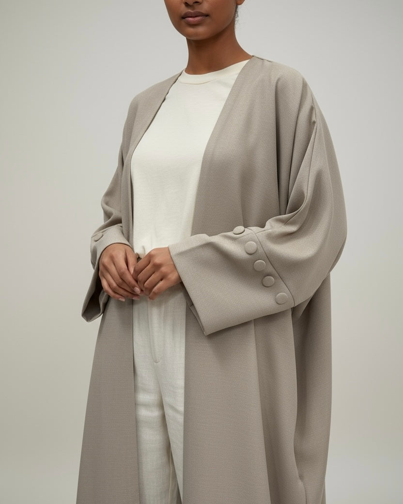 The abaya features wide sleeves with a row of fabric-covered buttons, adding a contemporary touch while keeping the overall look understated and chic. Lightweight and breathable, it’s an ideal choice for year-round wear, offering both comfort and sophistication.