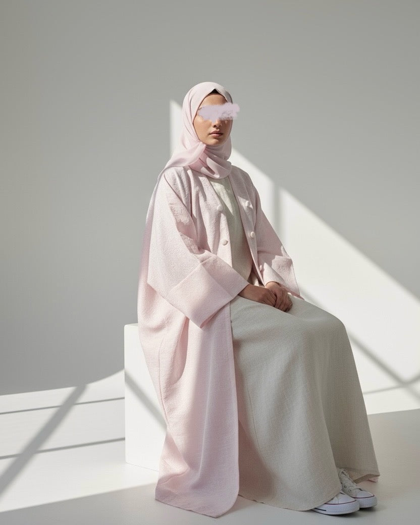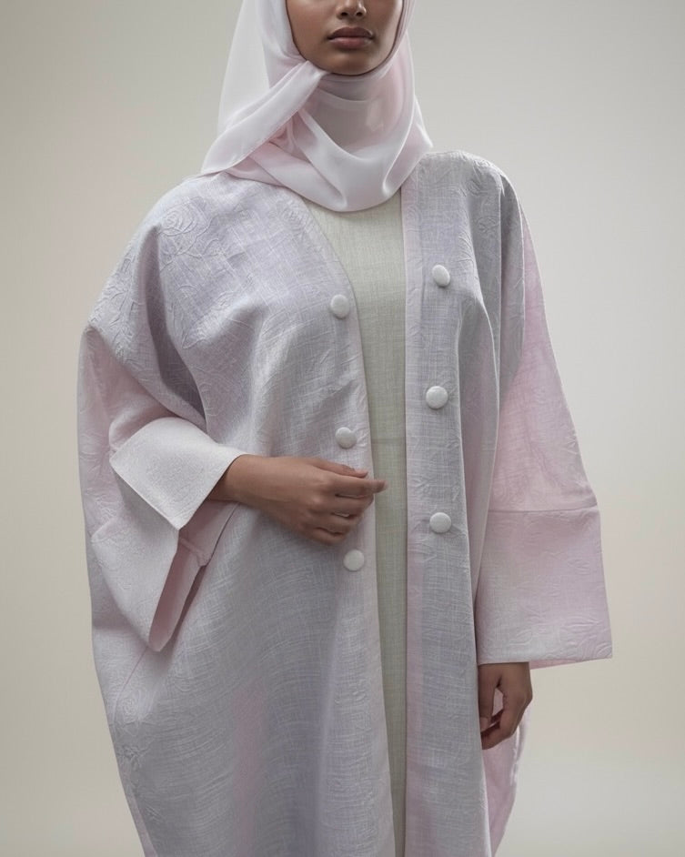 This gorgeous soft cotton candy pink colour abaya in a subtle flowery patterned natural linen, features beautiful decorative buttons at the front. The abaya does not come with inner dress.