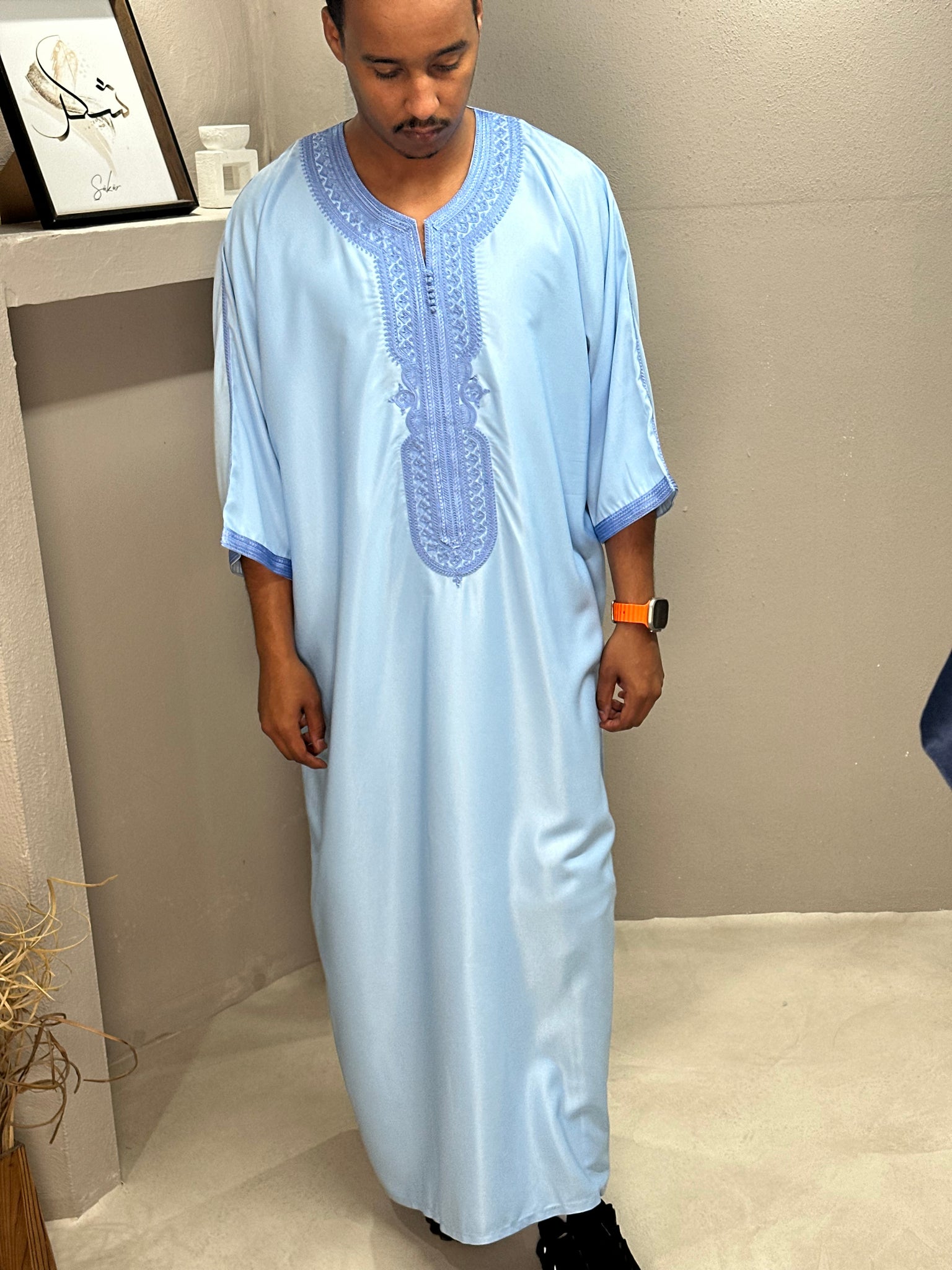 ky blue Moroccan thobe styled for Eid or festive occasions
