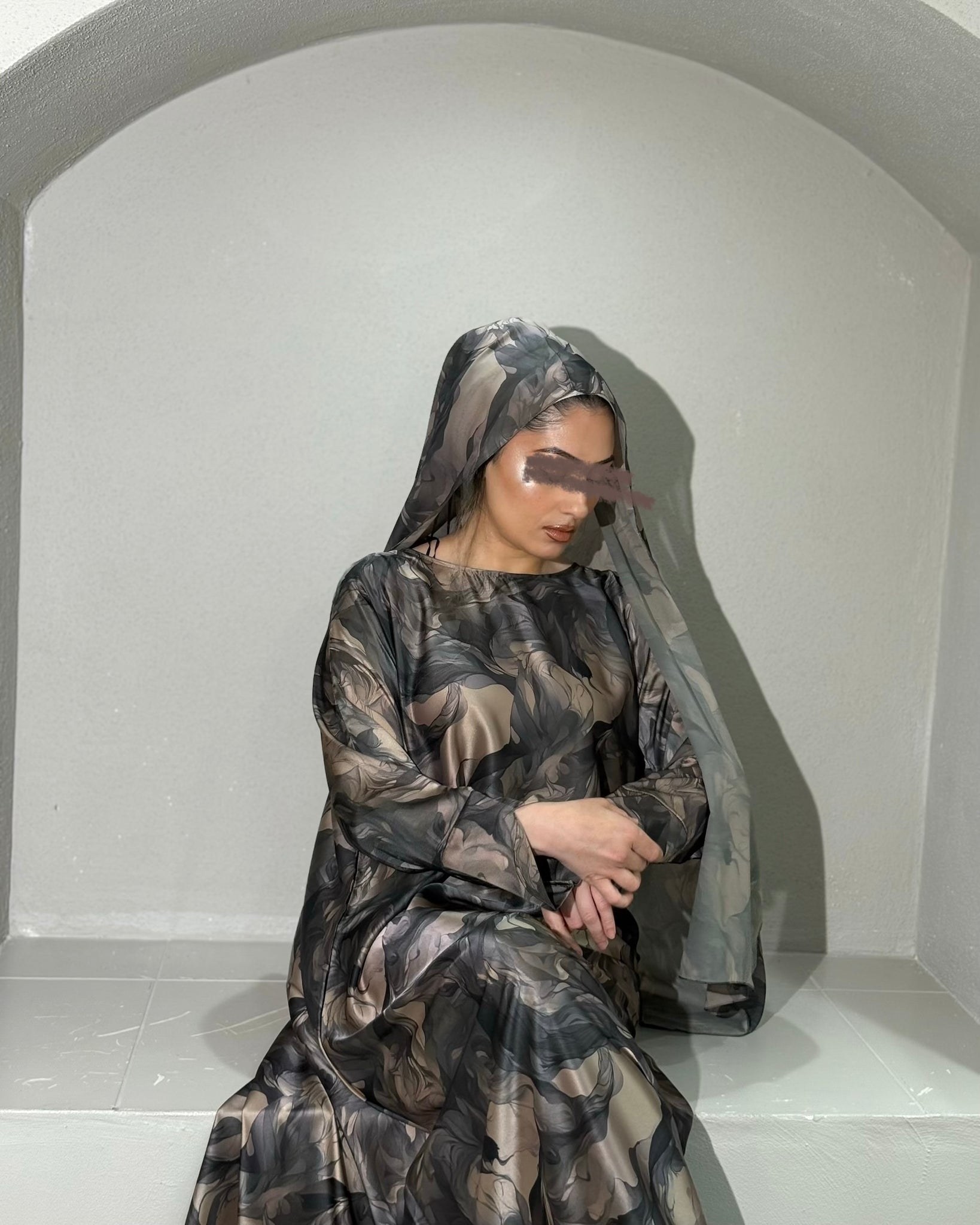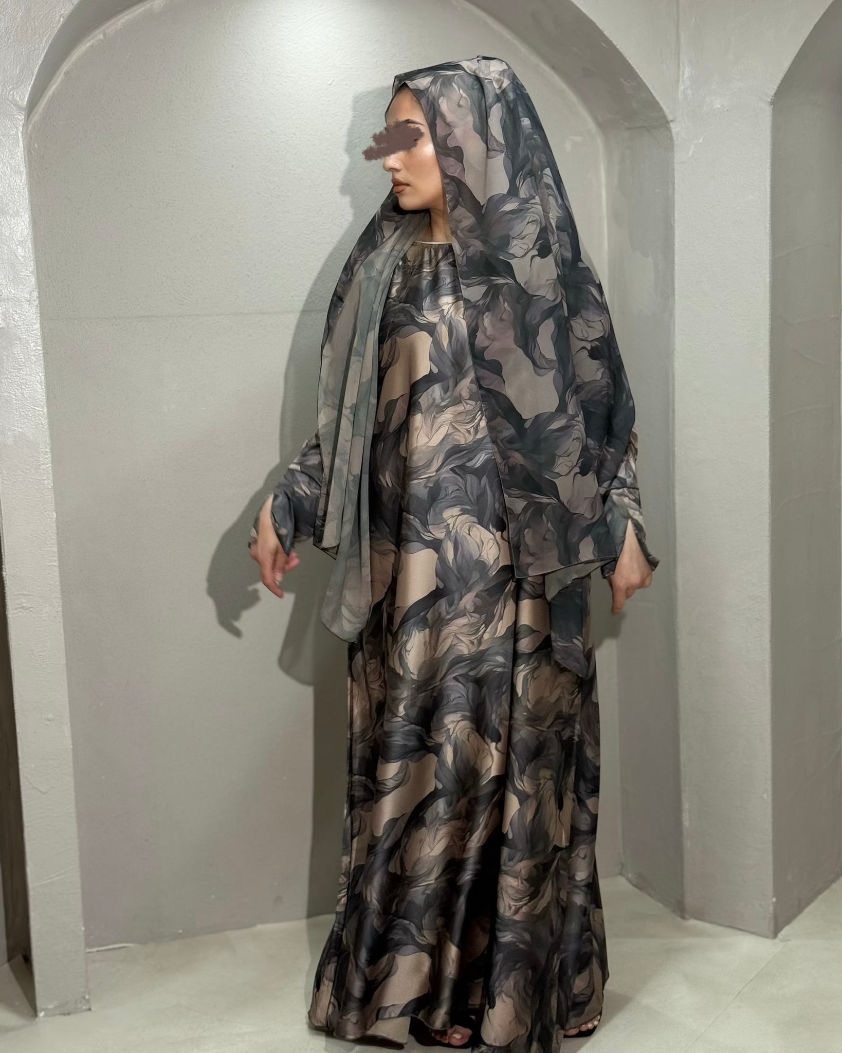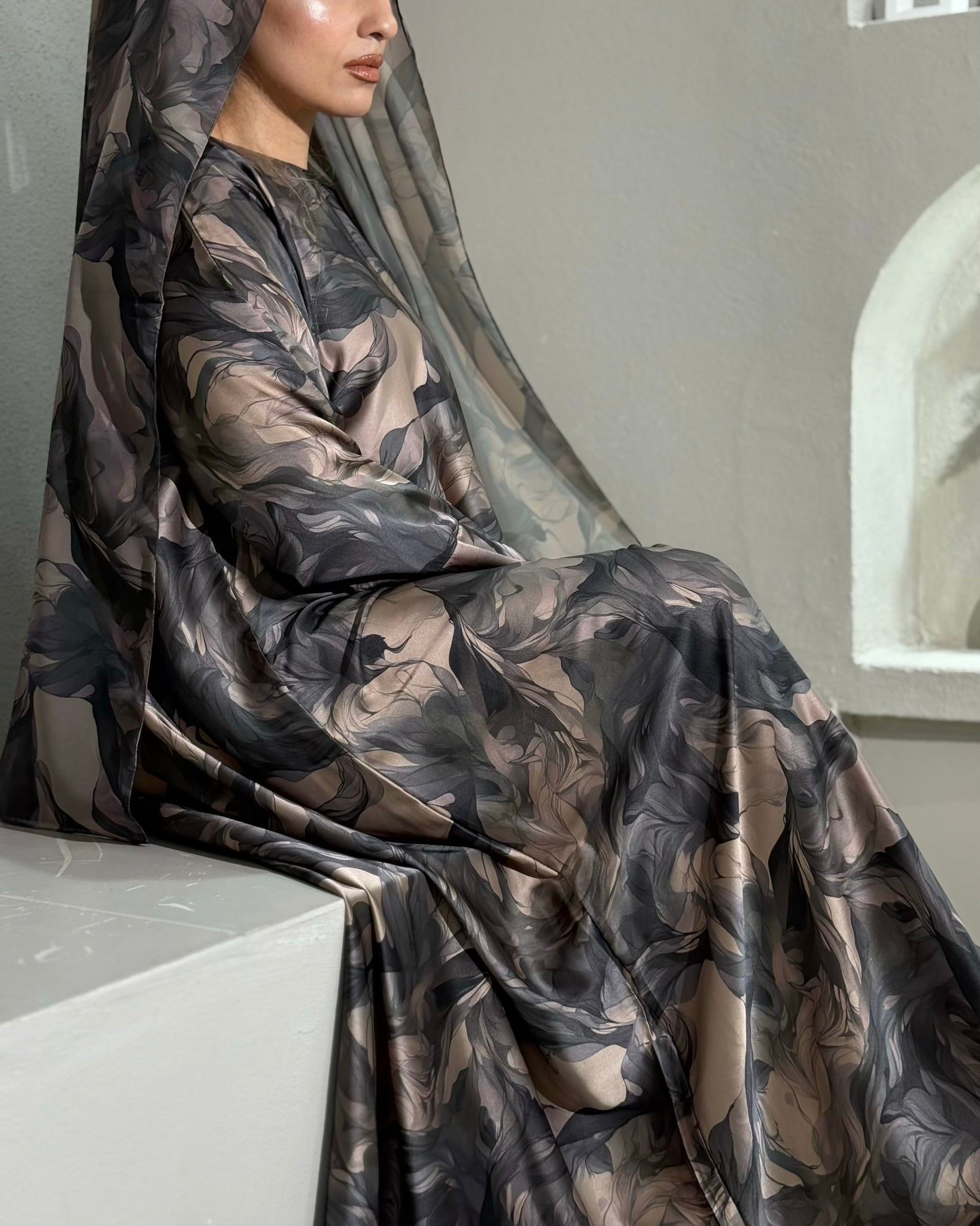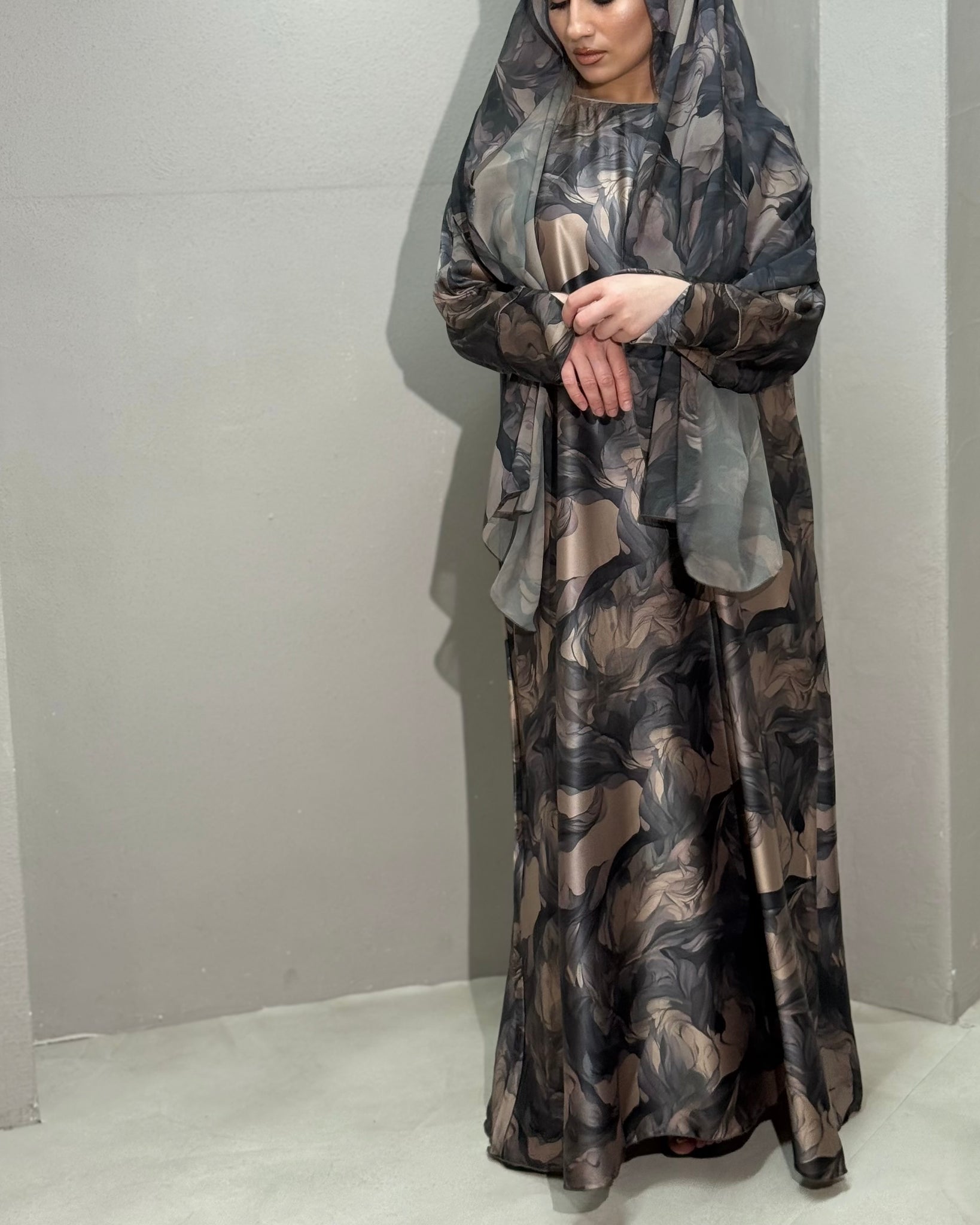 This Soft Satin abaya is beyond soft and silky, it’s simply luxurious. This beautiful floral print abaya features split sleeves and matching chiffon hijab. The dominant / primary colour is taupe.