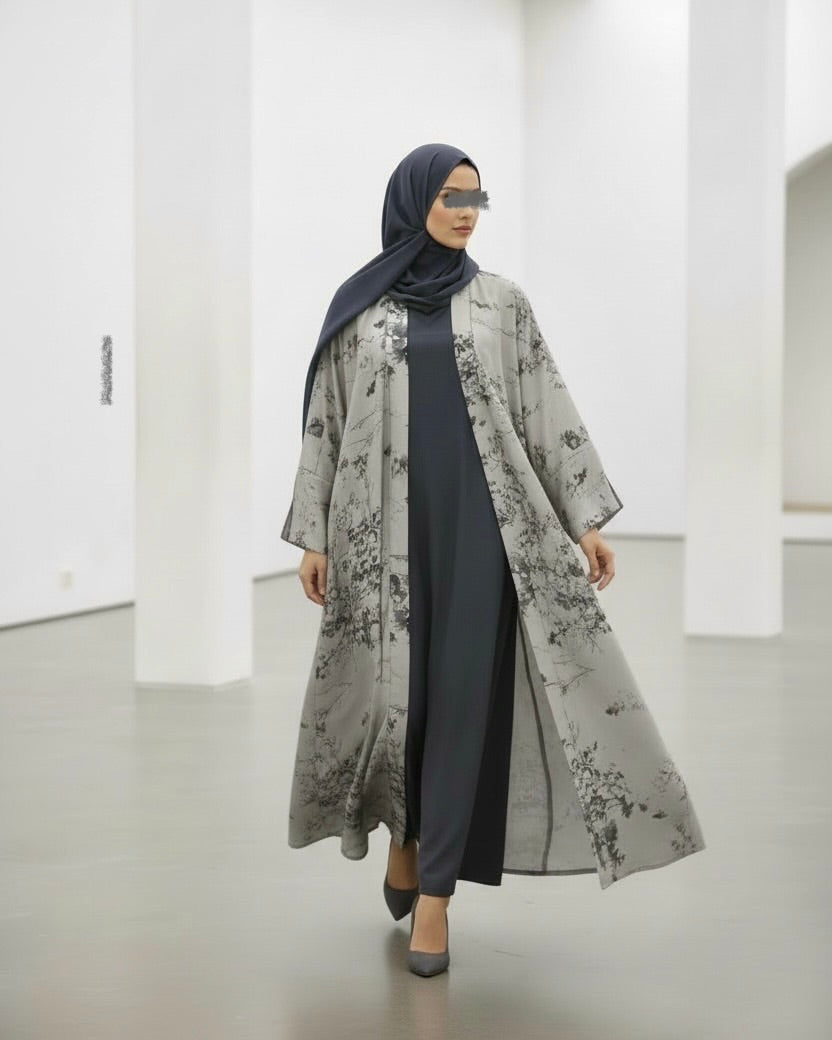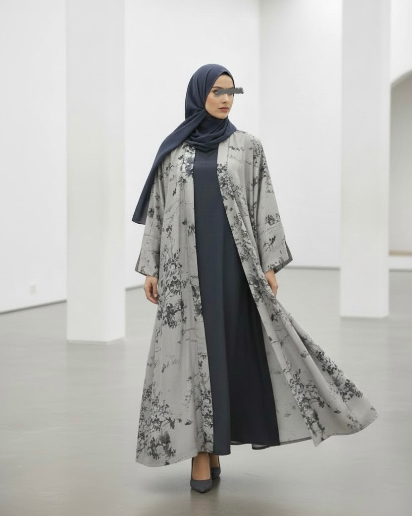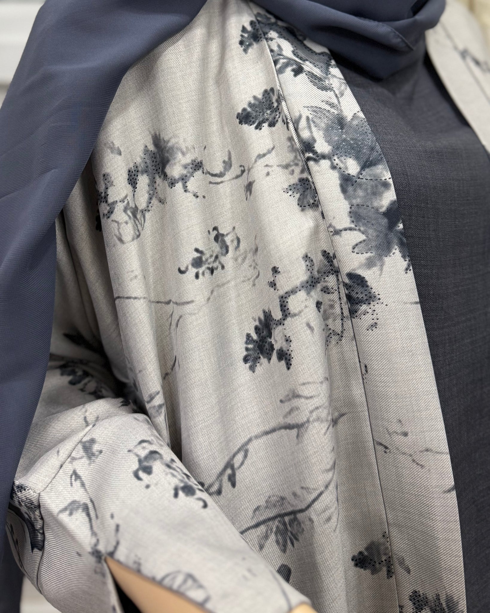 This three-piece abaya set features a flowing open outer layer in a soft dove grey tone with delicate charcoal floral print throughout. Paired with a deep slate inner dress and matching hijab, the contrast creates a beautifully balanced, modest silhouette.