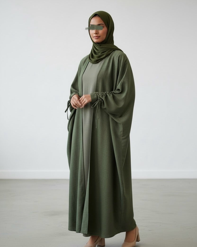A refined three-piece abaya set designed for effortless Ramadan dressing and elevated everyday wear. The outer abaya is crafted from premium Italian linen, cut in a flowing butterfly silhouette that drapes beautifully on the body. Finished with bow-tie sleeve detailing, allowing adjustable styling while adding a soft, feminine touch to the design.