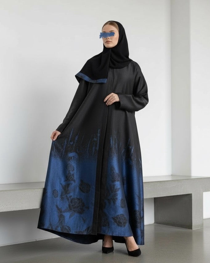 This elegant cloche-cut abaya is crafted from luxurious Taffeta Jacquard, a structured fabric known for its subtle sheen and woven floral detailing. Designed to hold its shape beautifully, the abaya offers a refined silhouette with a gentle flare that moves effortlessly with the body.