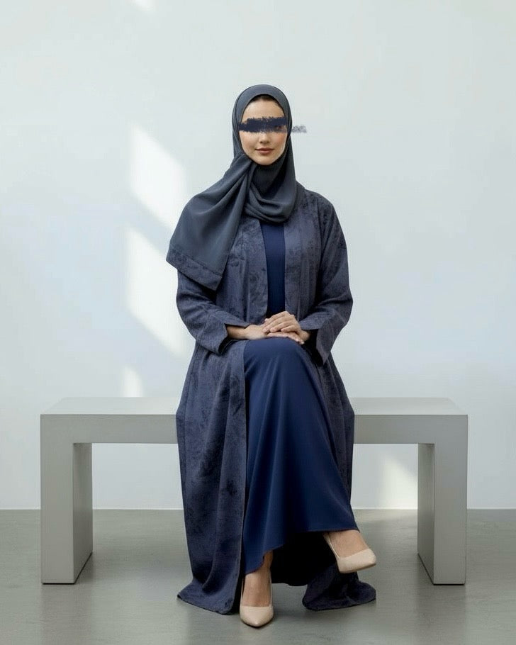 This stunning three-piece abaya set is crafted from premium Crepe, known for its soft texture, fluid drape, and luxurious finish.
