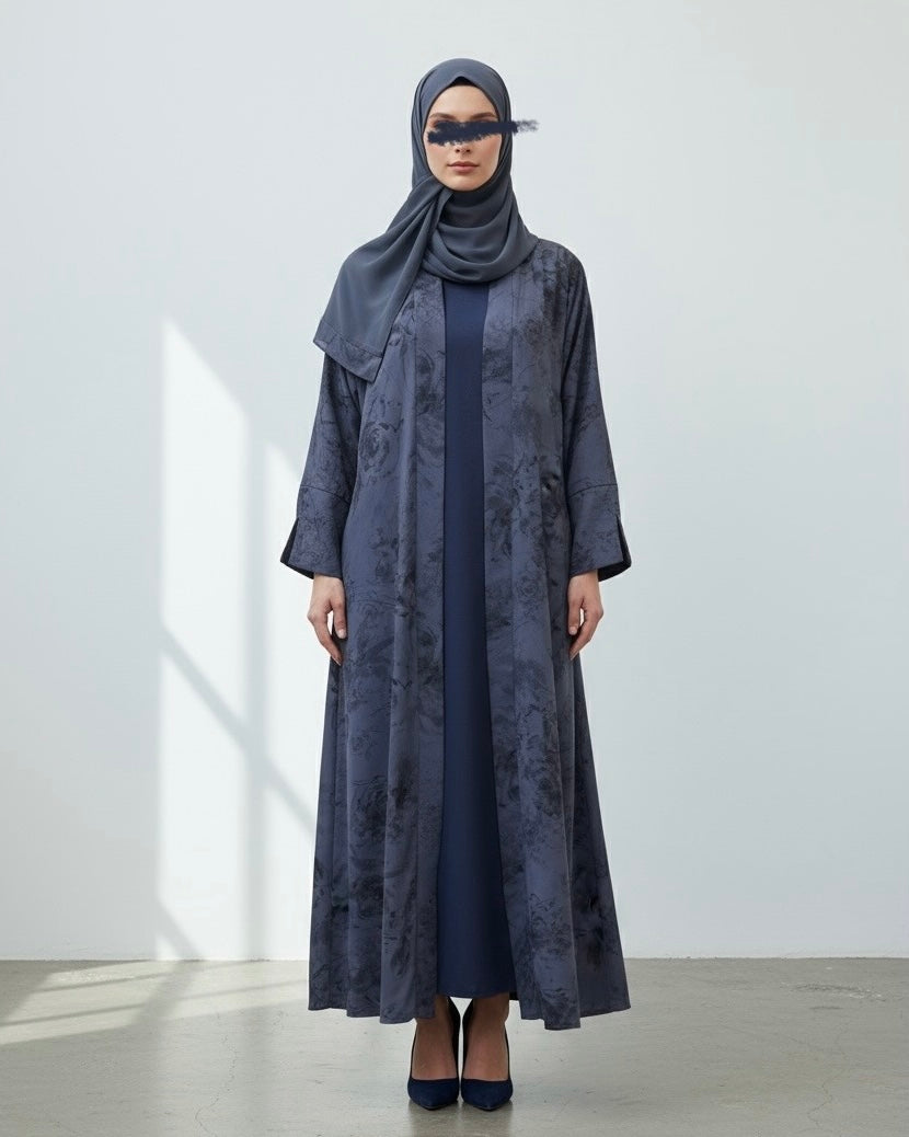 A statement of timeless elegance, this three-piece abaya set is crafted from luxurious Foil Crepe, a textured fabric featuring soft floral embossing with a delicate metallic sheen. The A-line silhouette flows gracefully, while the split sleeves add a touch of refinement and movement.