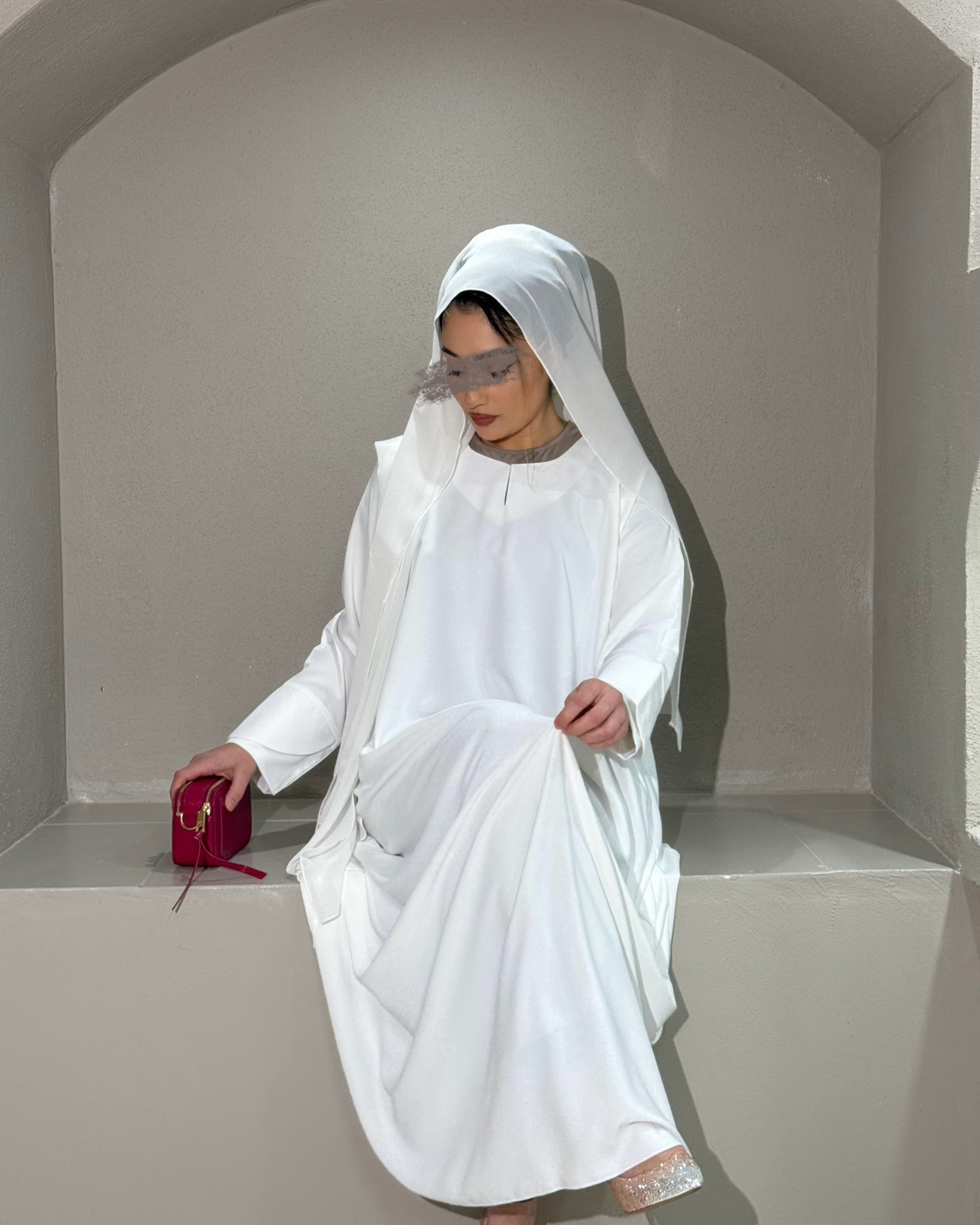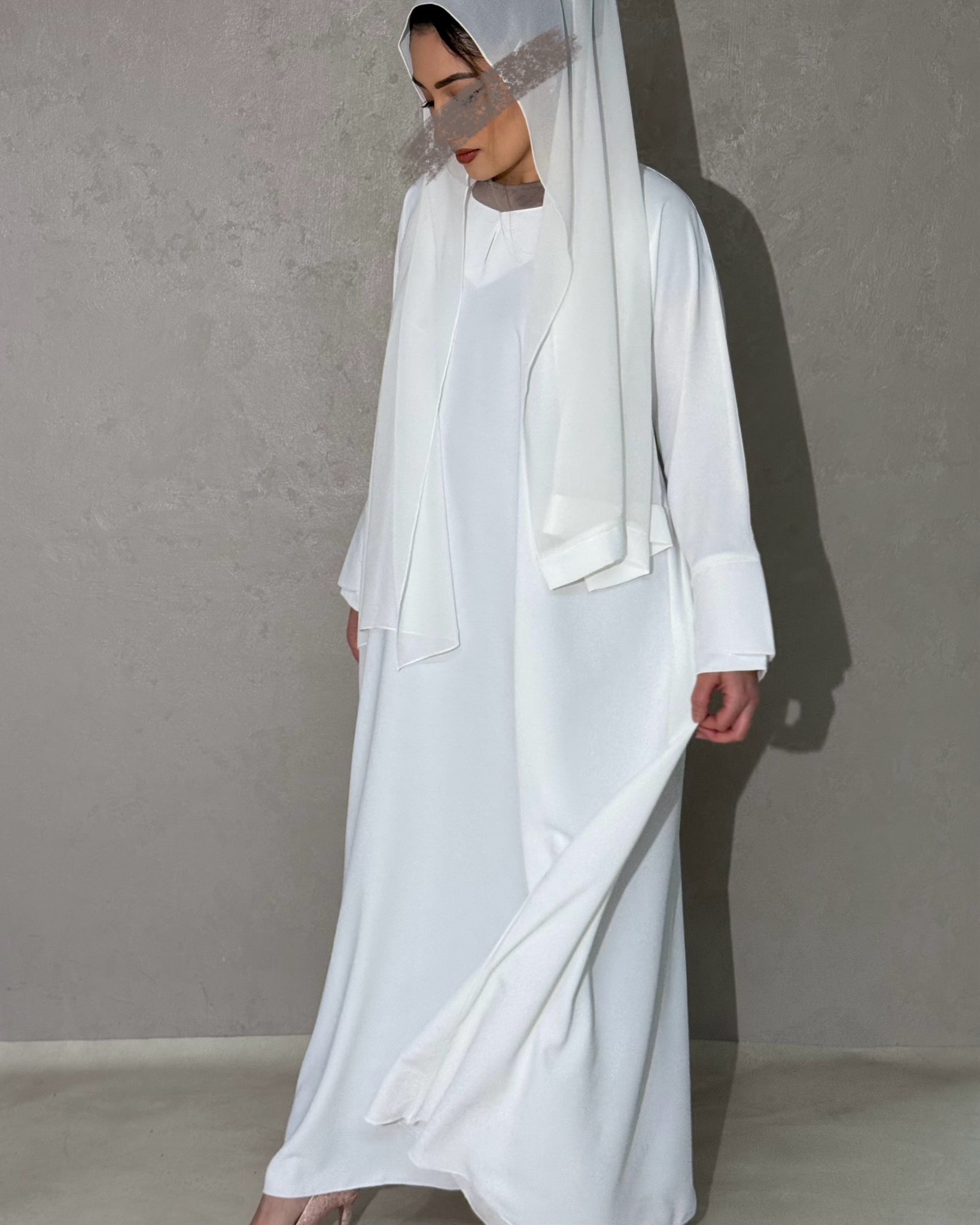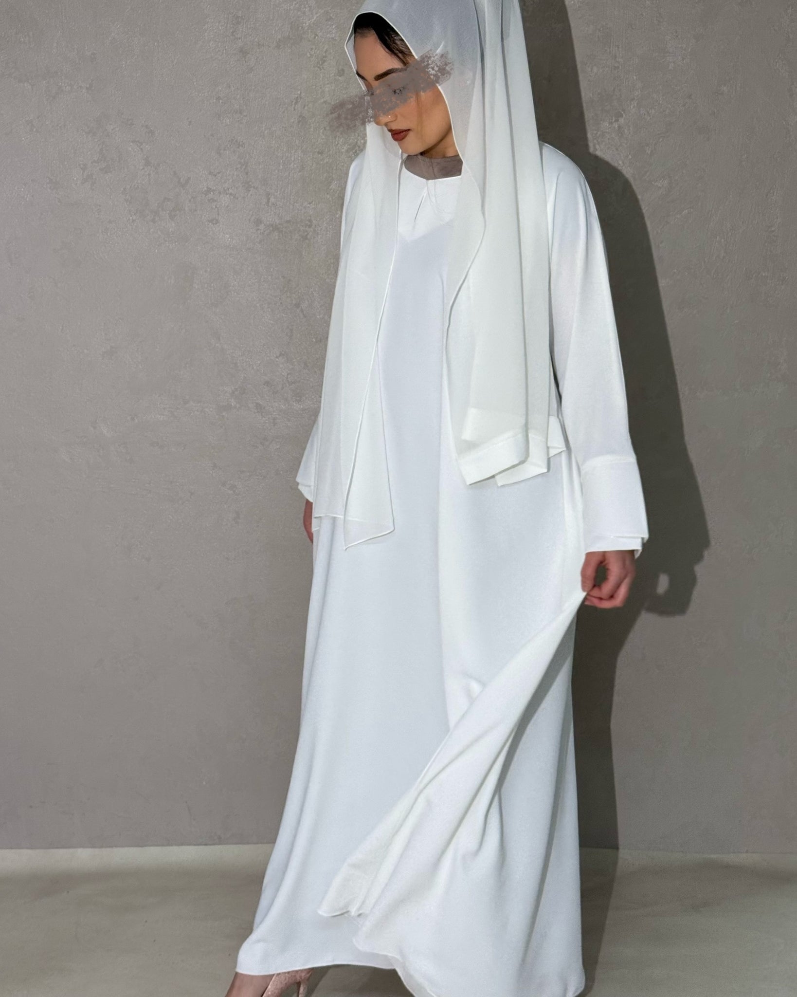 Also the most versatile abaya from our whole entire collections, it can be worn while running errands or even styling it up for a more formal event due to the subtle patterned fabric and gorgeous tulip cut sleeves. What a perfect addition to any wardrobe !